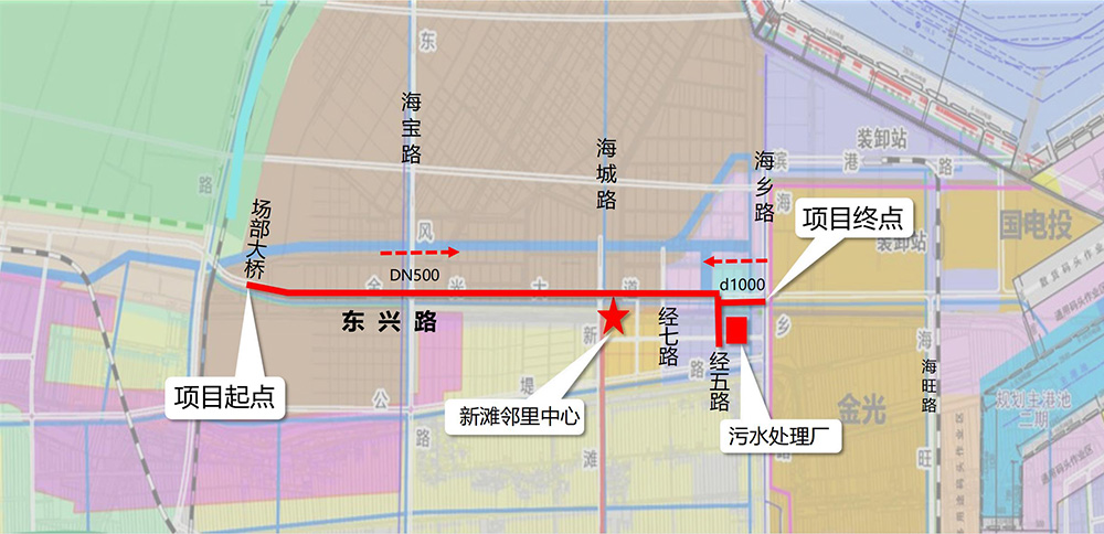 項(xiàng)目西起場(chǎng)部大橋,東至海鄉(xiāng)路,全長(zhǎng)約7.4公里,總投資約3600萬(wàn)元。其中,西段(場(chǎng)部大橋-經(jīng)五路)6.4公里為DN500壓力流管道,位于東興路北側(cè),負(fù)責(zé)轉(zhuǎn)輸污水處理廠(chǎng)以西范圍污水;東段(經(jīng)五路-海鄉(xiāng)路)1公里為d1000重力流管道,位于東興路南側(cè),負(fù)責(zé)轉(zhuǎn)輸污水處理廠(chǎng)以東范圍污水。近期先行實(shí)施經(jīng)七路至海鄉(xiāng)路段2.5公里污水管道,總投資約1500萬(wàn)元。